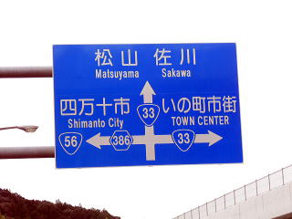 この道路標識が見えますが、ちょっとややこしい標識です。 「いの町」方面は、右側車線に入らないでください。 |